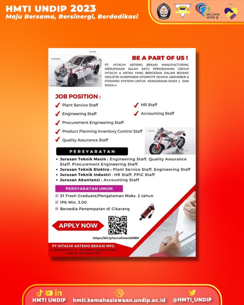 Apa kabar, gimana nih liburannya? Hitachi Astemo Bekasi Mfg saat ini sedang membuka lowongan pekerjaan loh sebagai HR Staff dan PPIC Staff.