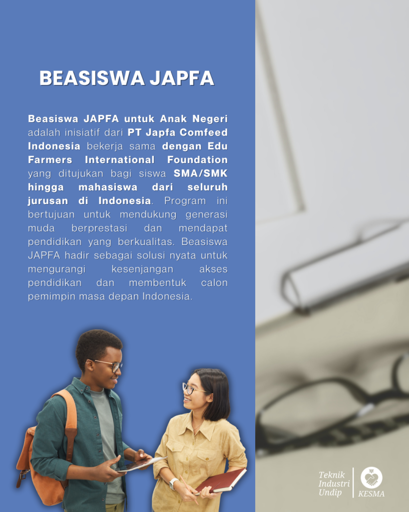 Ada kabar baik buat yang lagi cari beasiswa! Beasiswa JAPFA saat ini membuka pendaftaran. Jangan lewatkan kesempatan ini yaa, cek persyaratan dan ketentuannya di bawah ini!